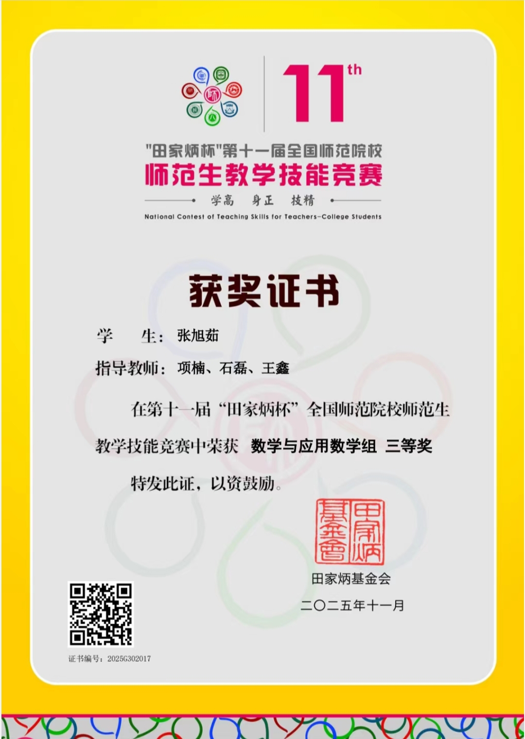 2025年11月18日,第十一届“田家炳杯”全国师范院校师范生教学技能竞赛初赛顺利落下帷幕。该项赛事作为国内规模最大、含金量最高的师范生教学技能综合学科竞赛,吸引了来自全国289所高校的学生同台竞技。经过激烈角逐,数理学院数学与应用数学专业张旭茹凭借出色的教学技能,斩获全国三等奖。