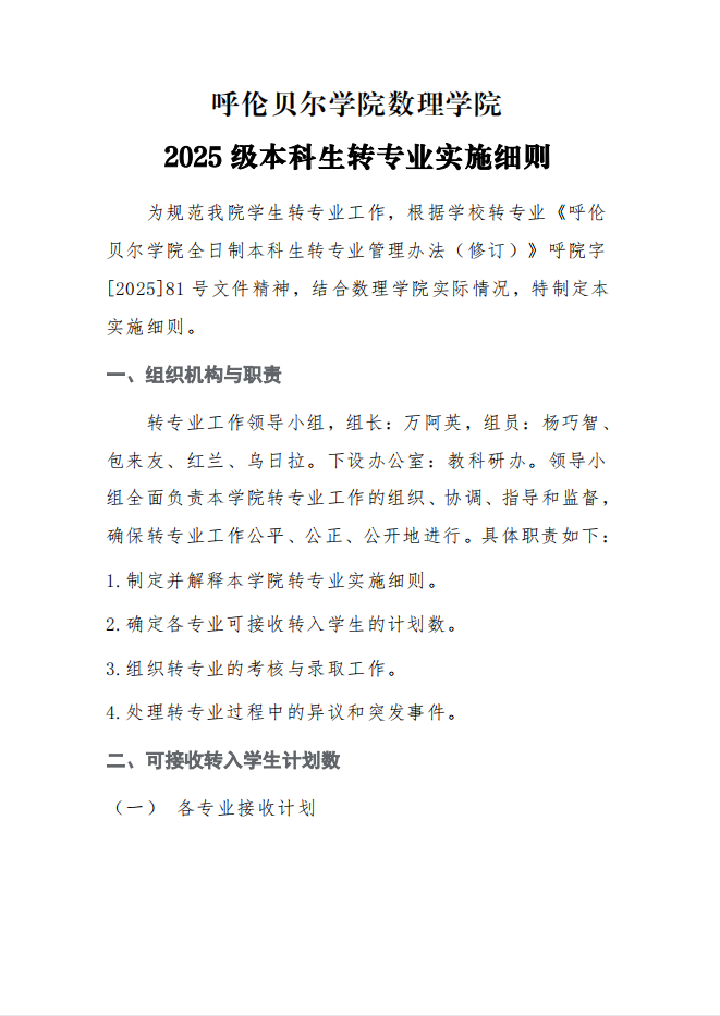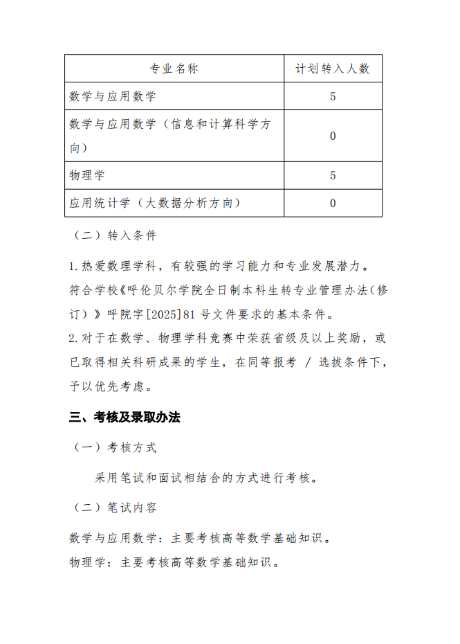 呼伦贝尔学院数理学院2025级本科生转专业实施细则