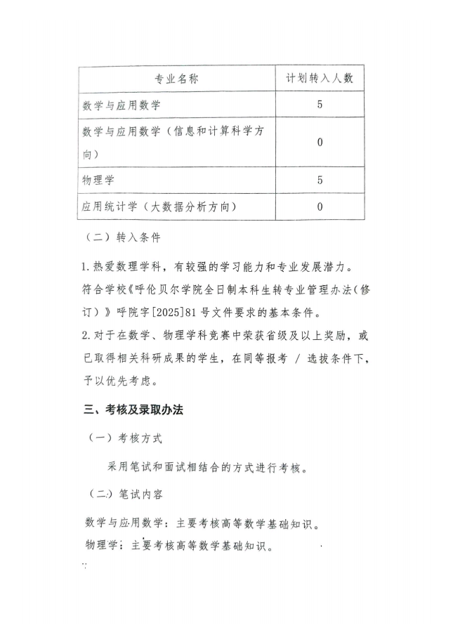 呼伦贝尔学院数理学院2025级本科生转专业实施细则